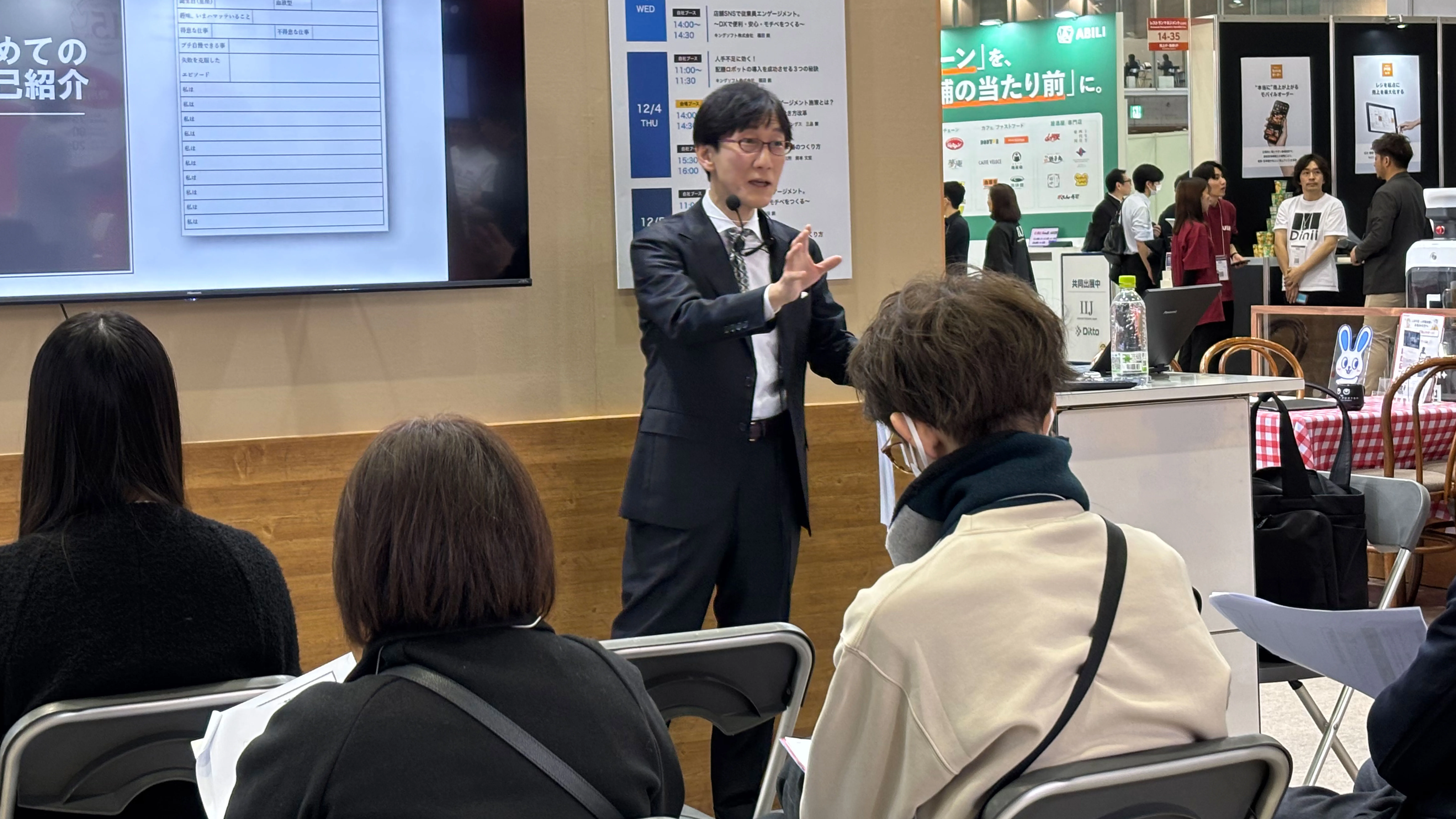 自社ブースでは、メンタルチャージISC研究所 岡本 文宏様を特別講師にお迎えして、「仕事ができる人材が辞めない職場のつくり方」をテーマに、繁盛店づくりの専門家として、実践的なノウハウをご講演いただきました。